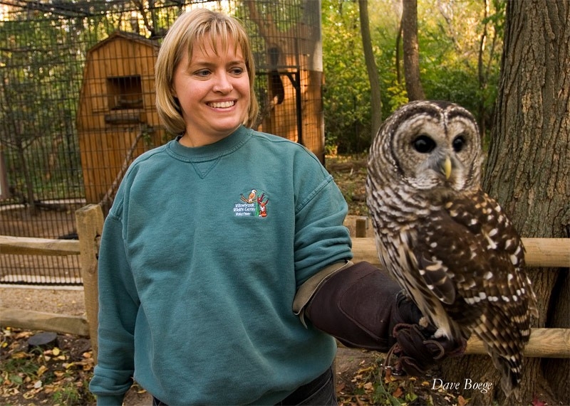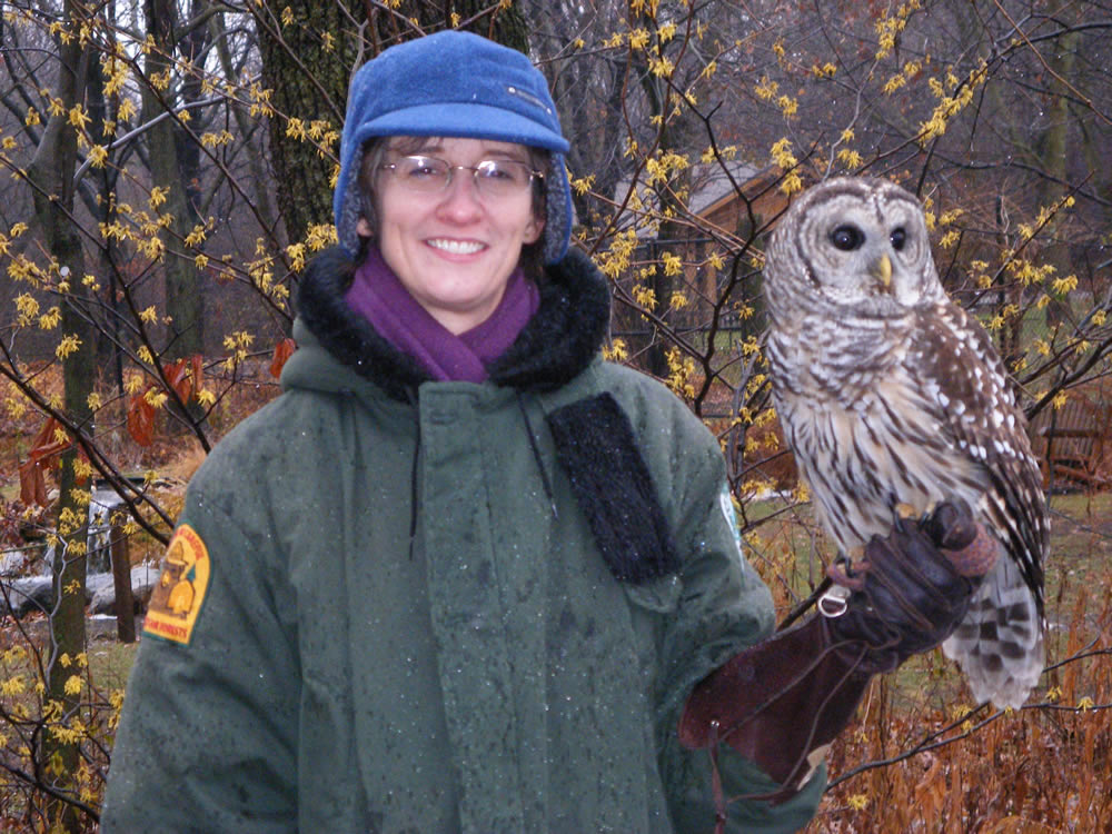Karen B. with Juno in front of the Barn Owl enclosure.